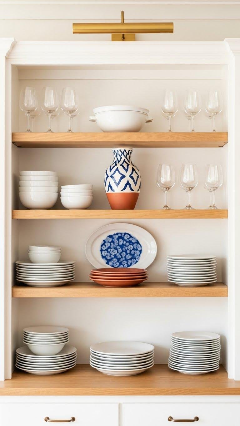 Although open shelving can feel casual, it’s one of the sharpest ways to showcase tableware—so arrange plates, glassware, and serving pieces like a thoughtfully edited vignette that balances function with aesthetics.