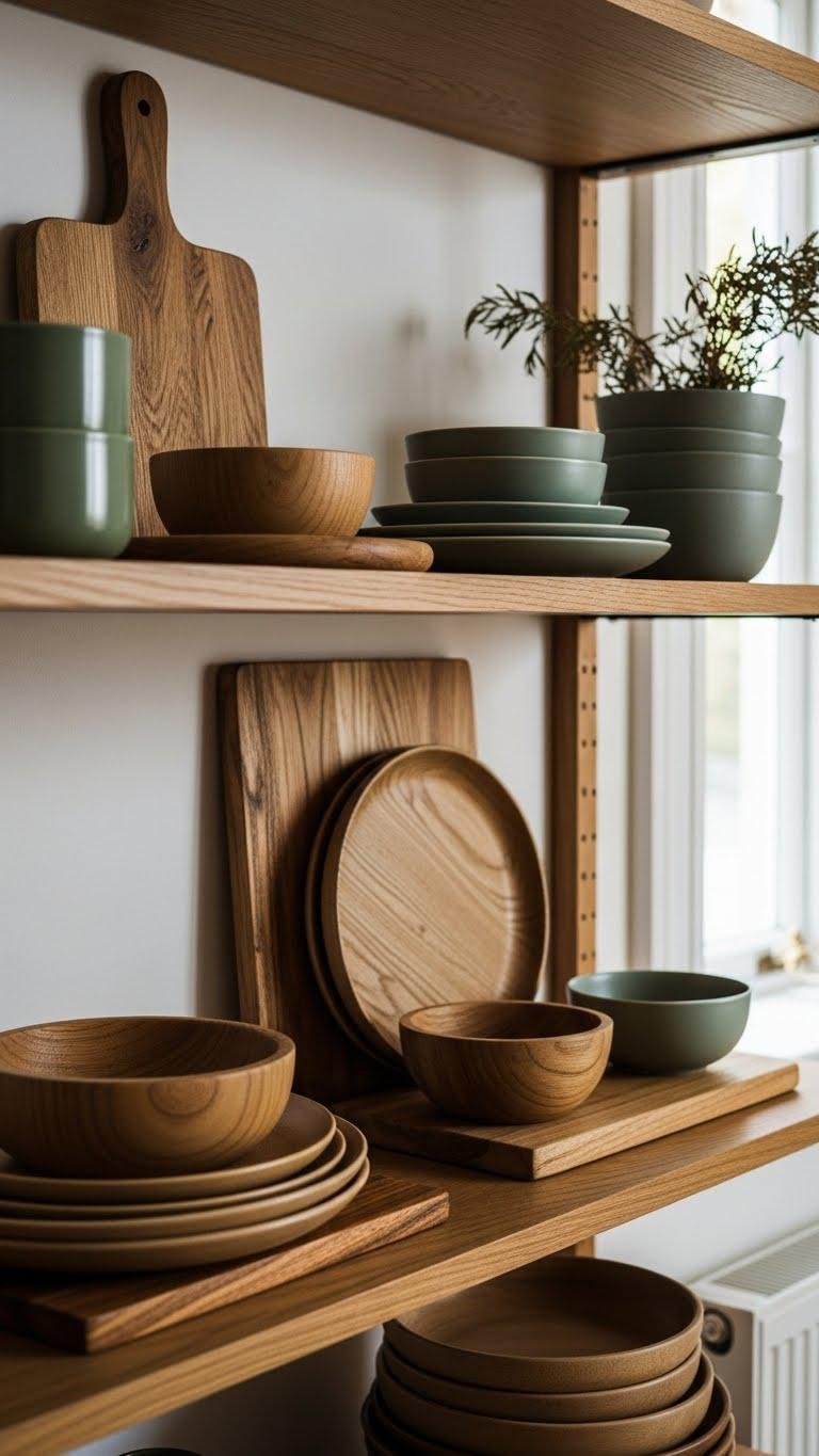 Showing off your tableware on open shelving highlights pieces worth keeping for years, so match that longevity with materials that age beautifully: choose sustainable hardwoods like oak or acacia. You’ll want sustainably sourced oak for durability and provenance, and consider acacia grain selection for bold, lived-in texture. Pick finishes that honor the wood’s character and let your dining room breathe.