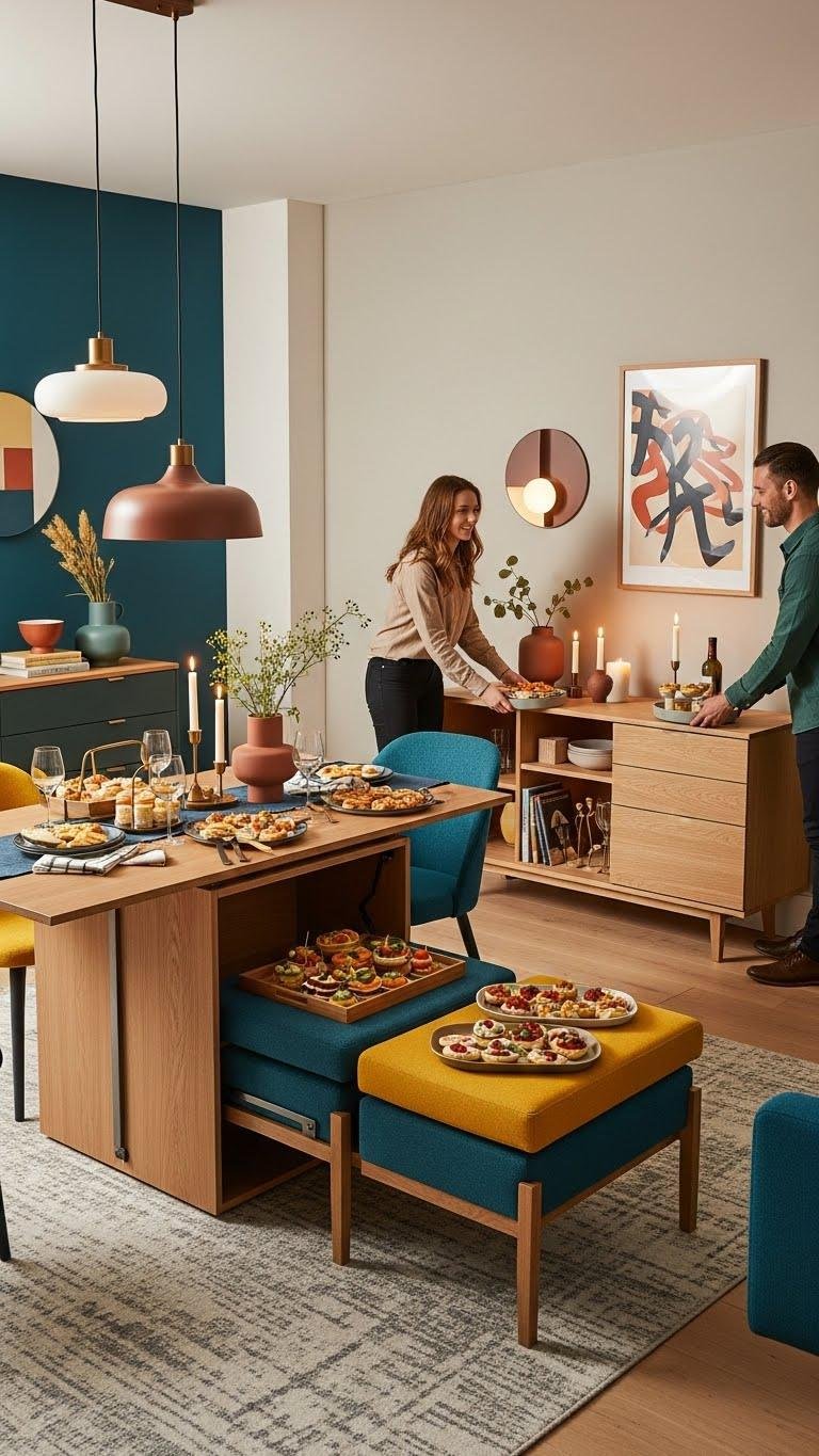 Those bold color choices set the mood; now think about how the furniture supports gatherings as well as aesthetics. Choose a folding buffet for instant serving flexibility and a modular credenza that adapts to seating, storage, and display. You’ll host confidently, rearrange on impulse, and store essentials out of sight. Prioritize durable finishes, clean lines, and pieces that free you to entertain without fuss.