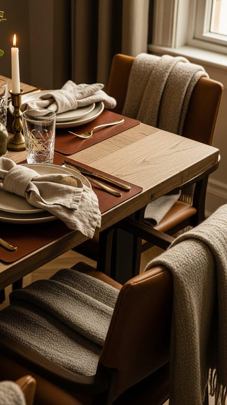 Choose linen napkins for effortless elegance and texture, pair them with leather placemats for structure, and drape soft throws over chairs for relaxed comfort.