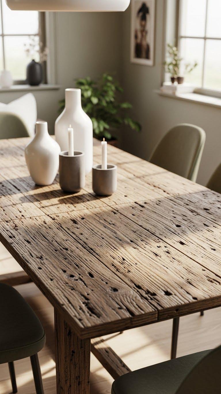 You’ll layer texture confidently: a weathered patina anchors the room while smooth ceramics and metal accents create tactile contrast.