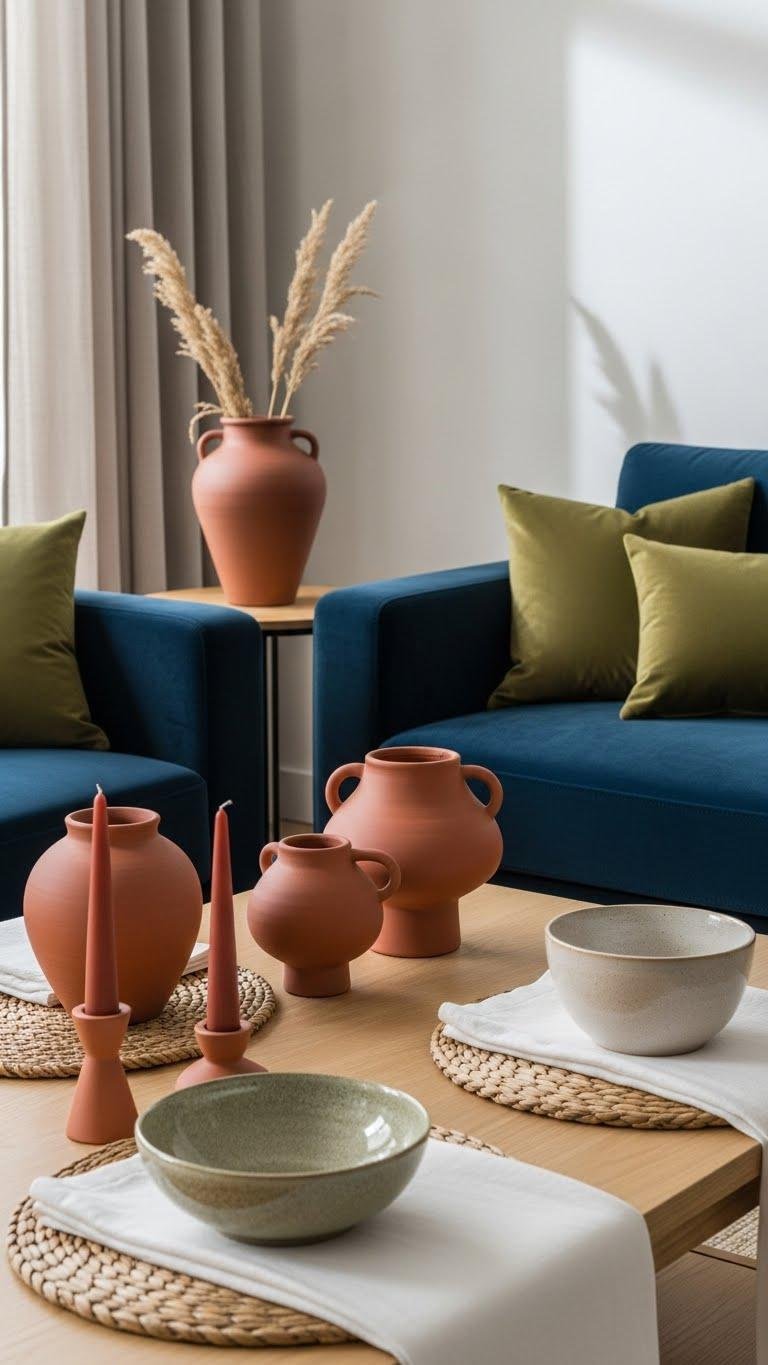 To balance jewel-toned velvet and clean lines, introduce terracotta and olive-green accents to warm the palette and ground the space. You’ll layer terracotta textures—pottery, matte vases, woven placemats—against crisp linens, then punctuate with olive accents in cushions, candlesticks, or a ceramic bowl. Keep arrangements sparse and purposeful so the room feels liberated, grounded, and effortlessly curated.