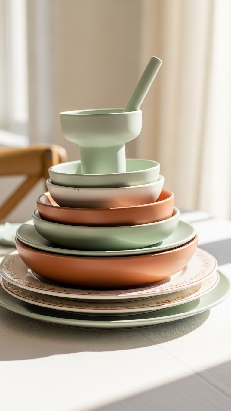 Stack stacked, color-coordinated dishes to turn everyday tableware into an instant centerpiece: pick two or three hues that echo your room’s palette, alternate plate sizes for a tapered silhouette, and finish with a small vase or sculptural bowl on top for height. You’ll love color matched stacking with vintage patterns pairing — mix matte tones and worn florals, keep proportions clean, and swap pieces freely.