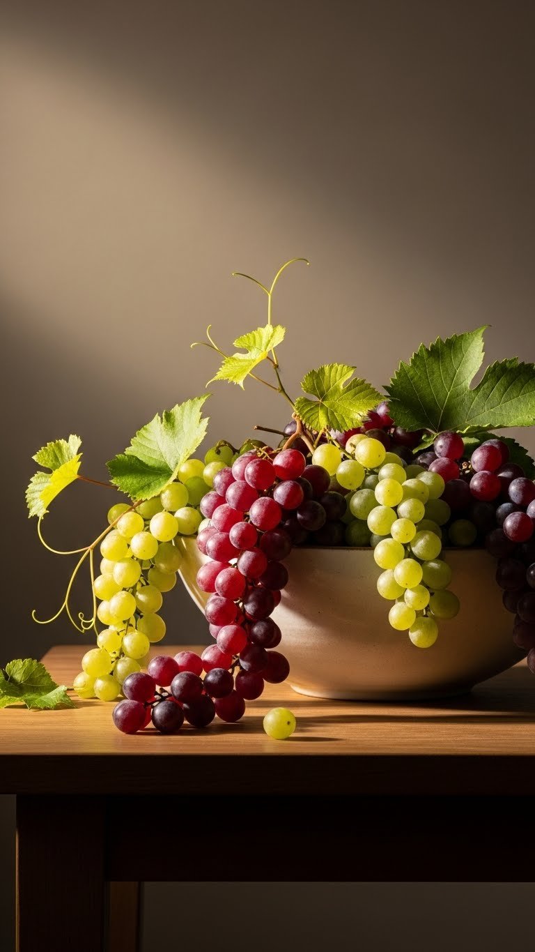 Bring cascading grapes into a low bowl to create a luxuriously effortless centerpiece that reads both modern and abundant. Let clusters spill over edges, mixing purple and green for contrast. Tuck in grape tendrils and a few glossy leaves for movement. You’ll set a relaxed, stylish scene that invites conversation and easy wine pairing, signaling generous hospitality without fuss.