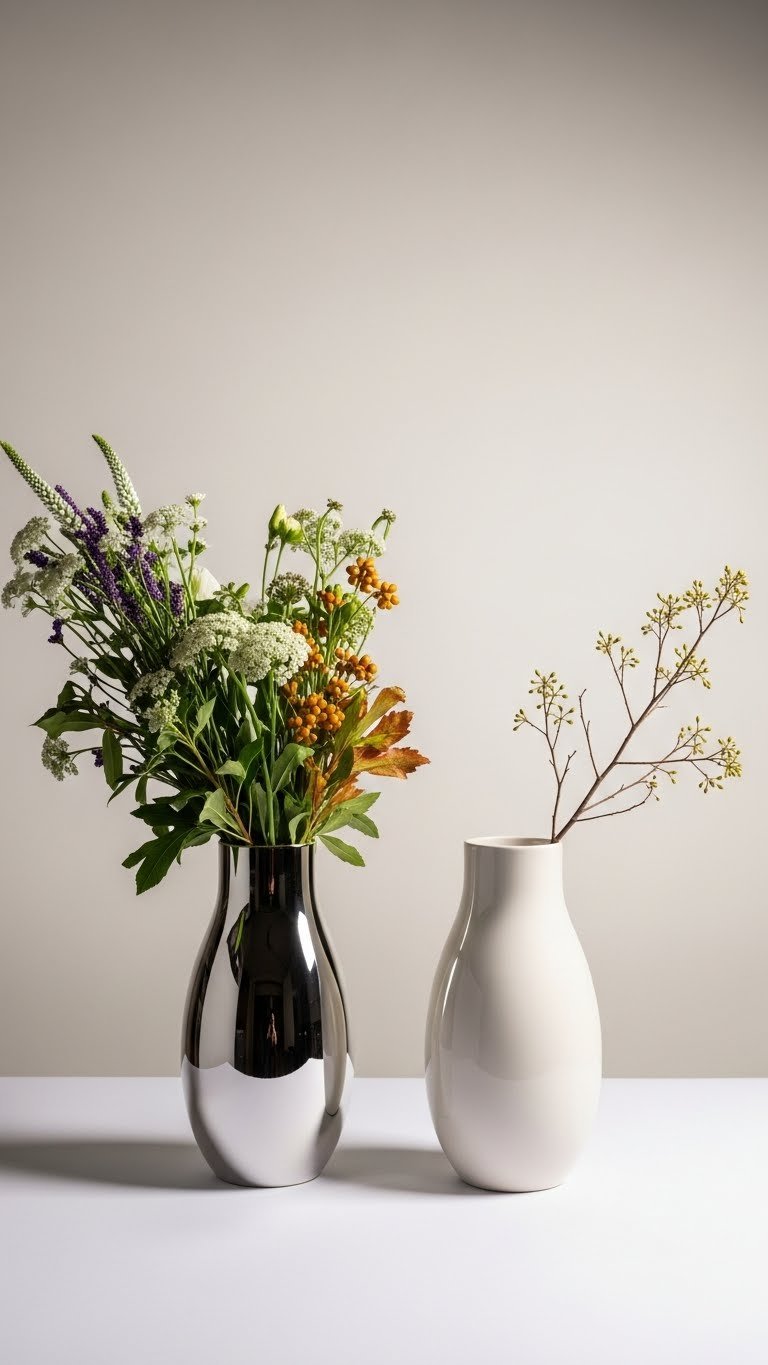 When you pair two vases—one brimming, one deliberately sparse—you create a striking half-full, half-empty effect that reads modern and thoughtful; the contrast draws the eye and lets negative space breathe.