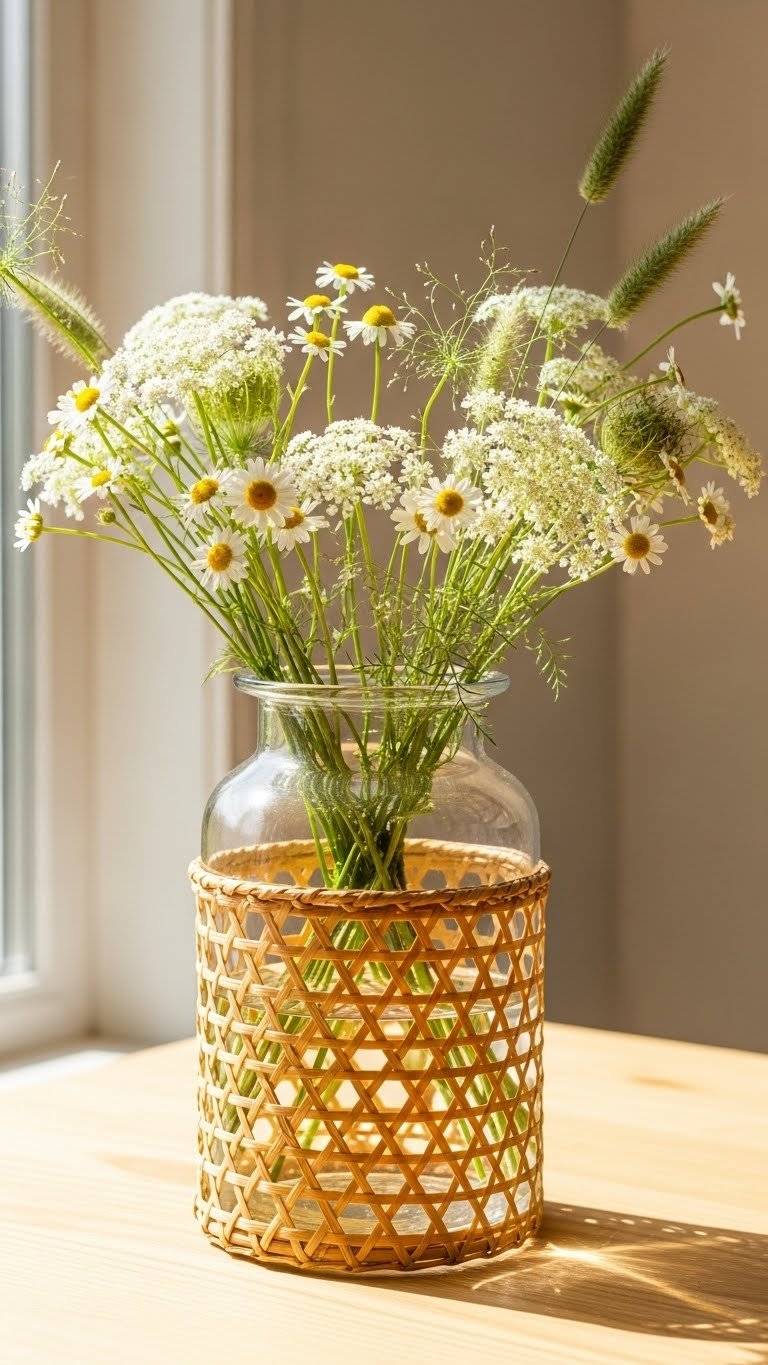 Bring a touch of warm texture to your table with a rattan-wrapped glass vase filled with loose, meadow-style wildflowers that spill casually over the rim. You’ll love the rattan texture contrast against smooth glass; it feels effortless, wanderlust-ready. Choose a relaxed wildflower pairing—daisies, Queen Anne’s lace, and grasses—for a breezy, free-spirited centerpiece that’s modern, tactile, and uncomplicated.