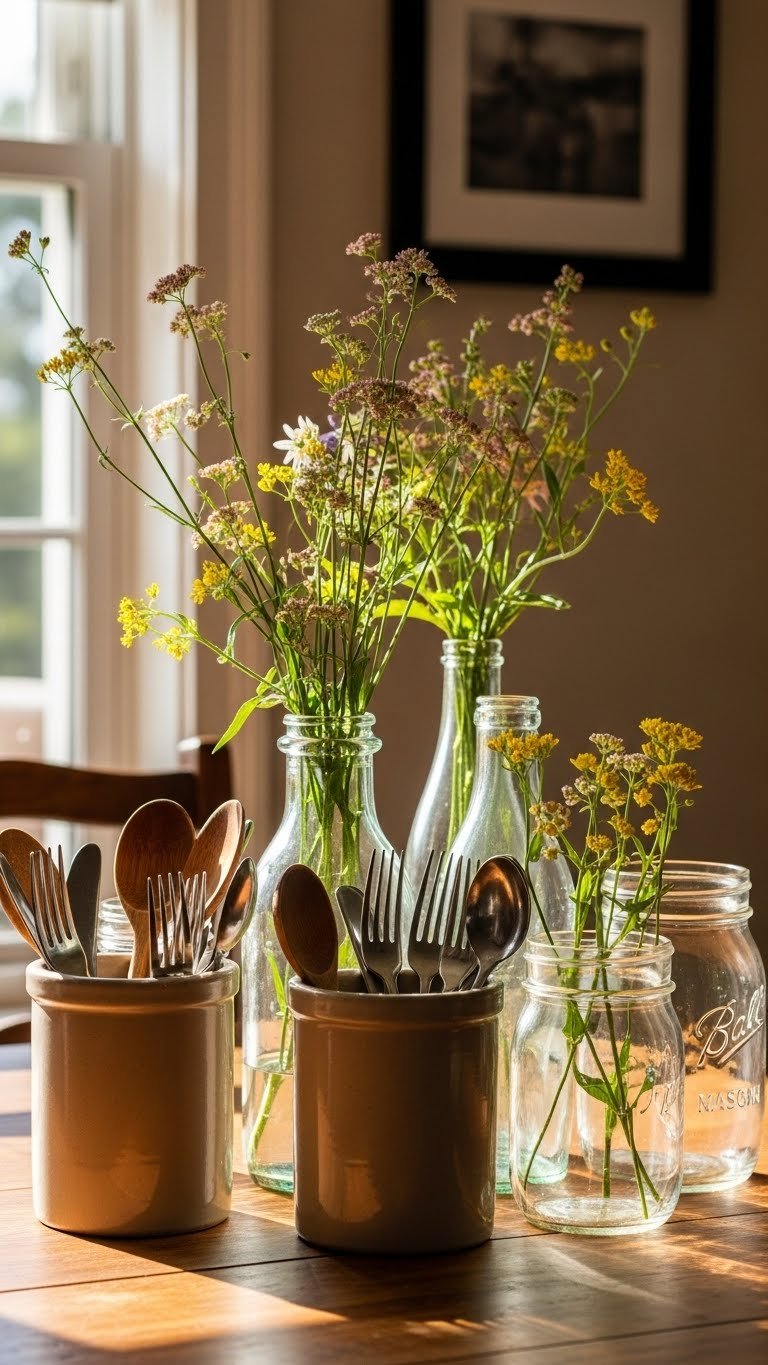 Group a few mismatched glass or ceramic jars and you’ll get an instant, relaxed centerpiece that feels both lived-in and on-trend. Arrange mason jars and utensil holders in varied heights, filling some with mixed stems and others with forks and wooden spoons. Let a loose floral variety breathe — effortless, mobile, and rebellious, perfect for a table that invites casual gatherings.