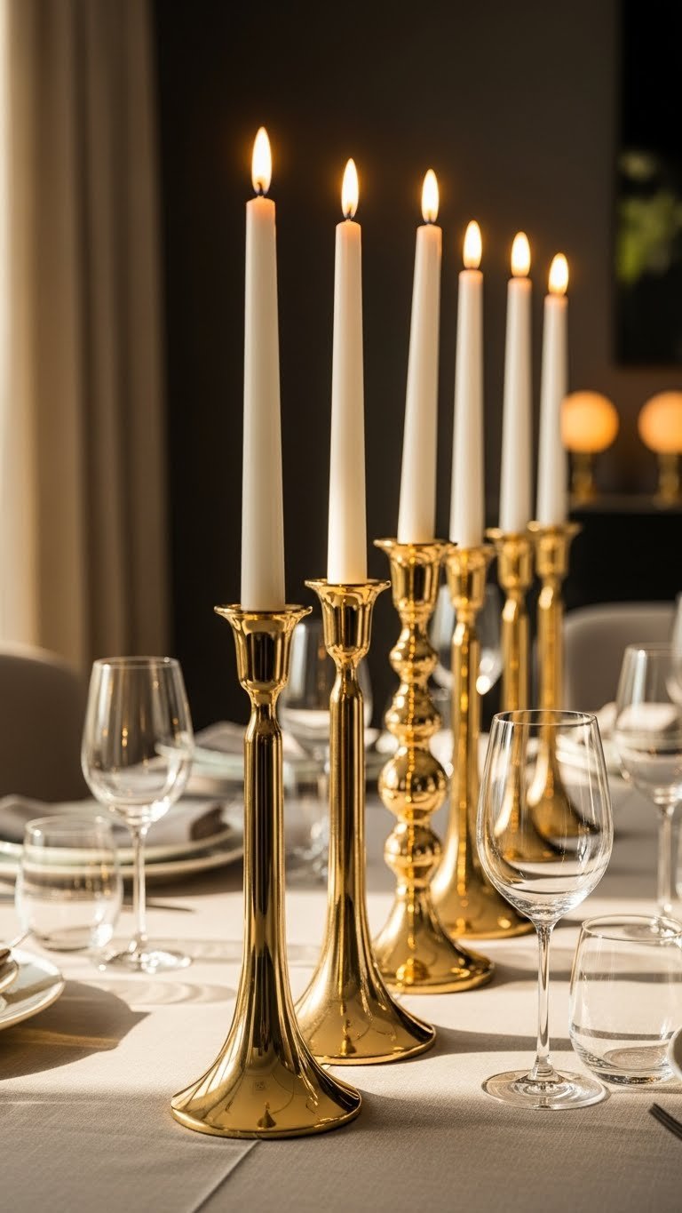 Elevate your table with gold candle holders topped with flameless taper candles for a glow that’s luxe yet low-maintenance. You’ll love metallic accents that catch daylight and a warm glow after dusk. Arrange holders in elegant symmetry down the table for effortless movement and freedom from fuss. The flameless tapers provide safe ambient lighting, modern polish, and an unfussy, liberated vibe.