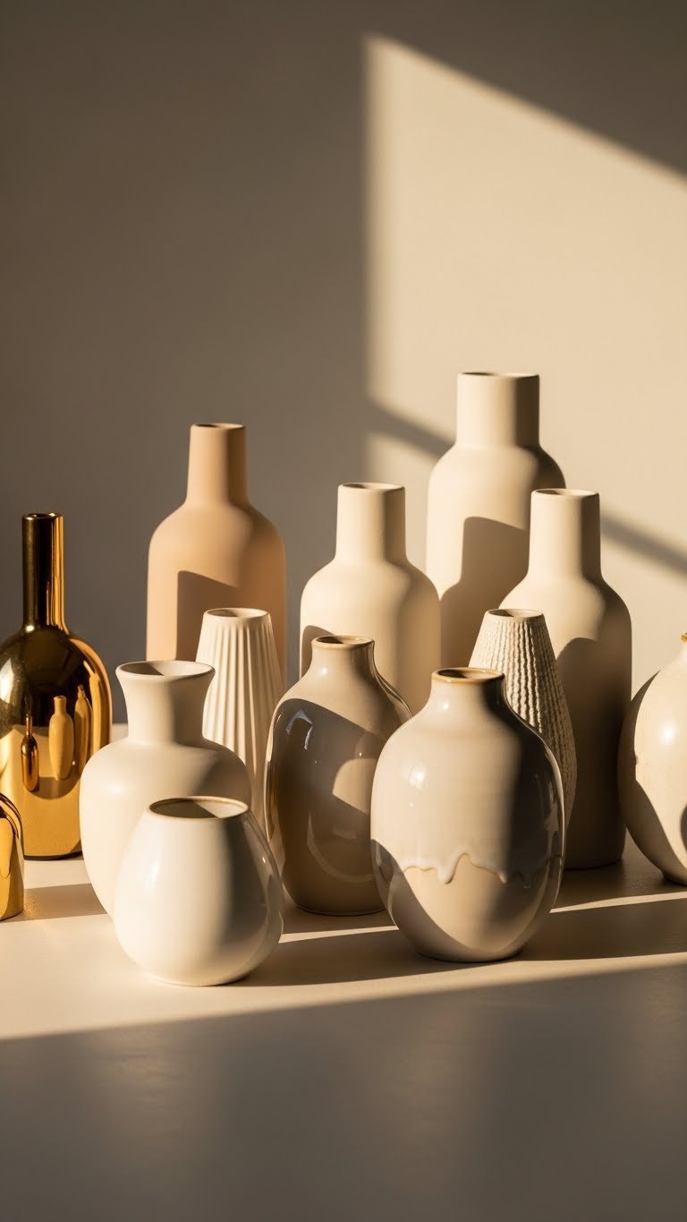 If you loved the warm, reflective feel of gold candle holders, carry that polished mood into a collection of mixed vases in a single palette. You’ll curate monochrome vases—varying heights, shapes, subtle glaze shifts—alongside textured ceramics for contrast. Cluster them loosely, leave breathing room, and swap stems seasonally. The result feels effortless, modern, and liberating, a table that’s unapologetically yours.