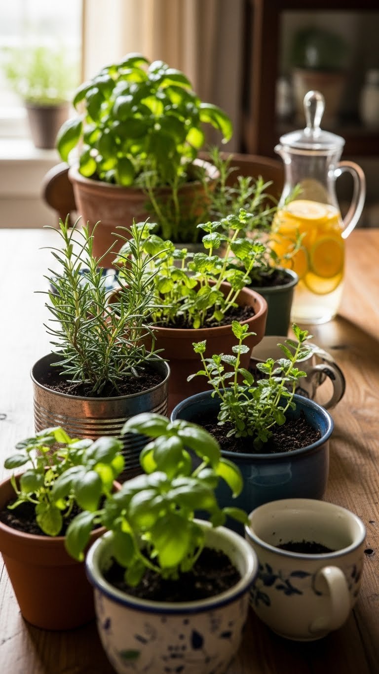 After the citrus carafe adds a bright, edible accent, line up potted herbs down the table to bring living texture and scent into the scene. You’ll mix terracotta, tin, and mismatched vessels that echo kitchen shelf charm, invite aromatic trimming between courses, and nod to windowsill gardens. Reach across for a daily harvest — basil, mint, rosemary — fresh, free, instantly usable.