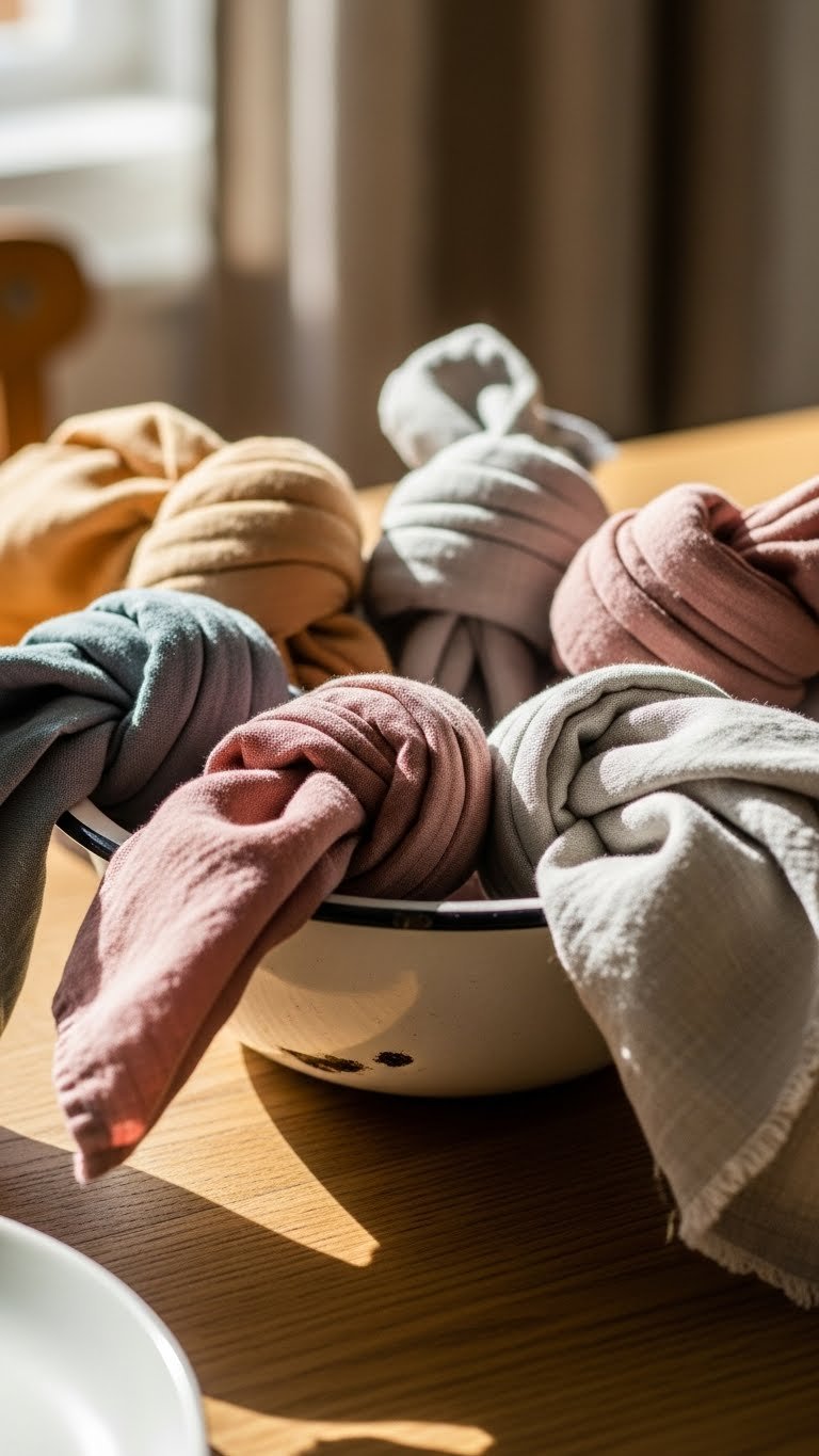 Give your table a playful, modern twist by knotting cloth napkins and tucking them into a low mixing or batter bowl as a casual centerpiece accent. You’ll love how linen knots add sculptural texture and effortless charm. Choose muted tones, raw ceramics, or a vintage batter bowl to keep it lived-in and free-spirited. It’s minimal, tactile, and unmistakably relaxed.