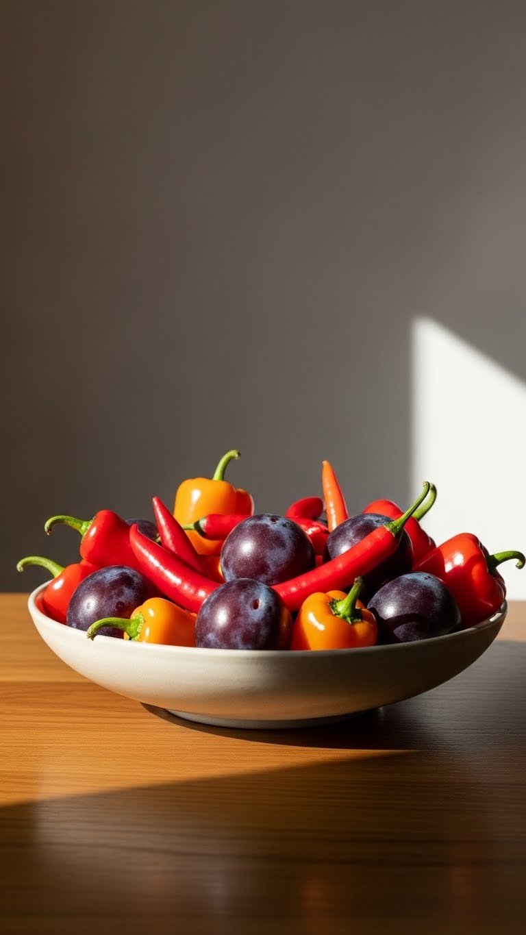 Bowl of Plums and Peppers for Vibrant Color