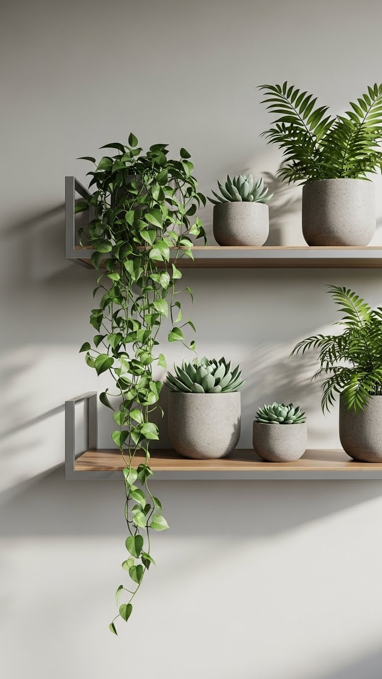 Often, you’ll find floating shelves turn a blank wall into a living vignette—sleek wood or matte metal planes that keep the room airy while giving plants a place to breathe. You’ll curate botanical vignettes with trailing pothos, succulents, and sculptural ferns, mixing textures and pots. Minimalist mounting keeps lines clean, so your greenery feels intentional, free, and effortlessly chic.