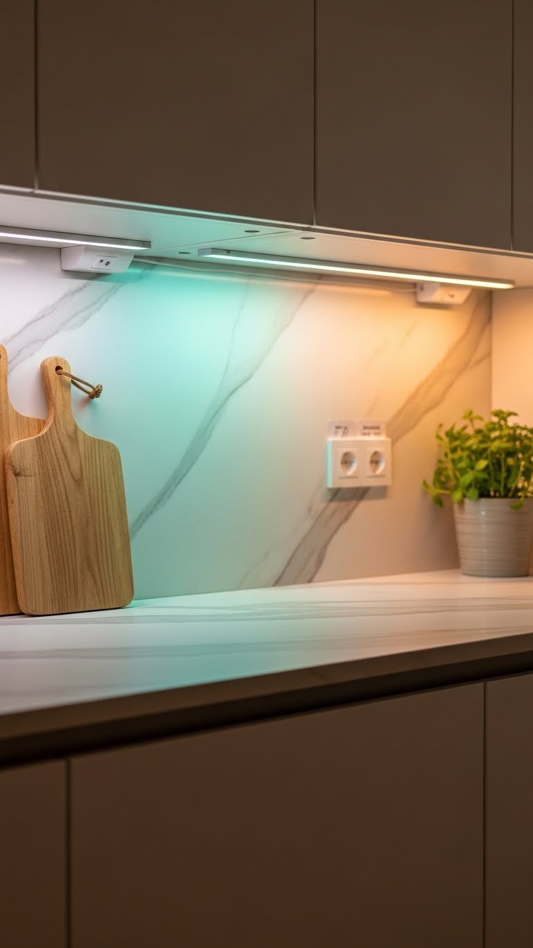 Beneath your cabinets, thin LED strips transform the kitchen from purely functional to effortlessly atmospheric, casting clear task light across countertops while adding a soft, modern glow after dark.