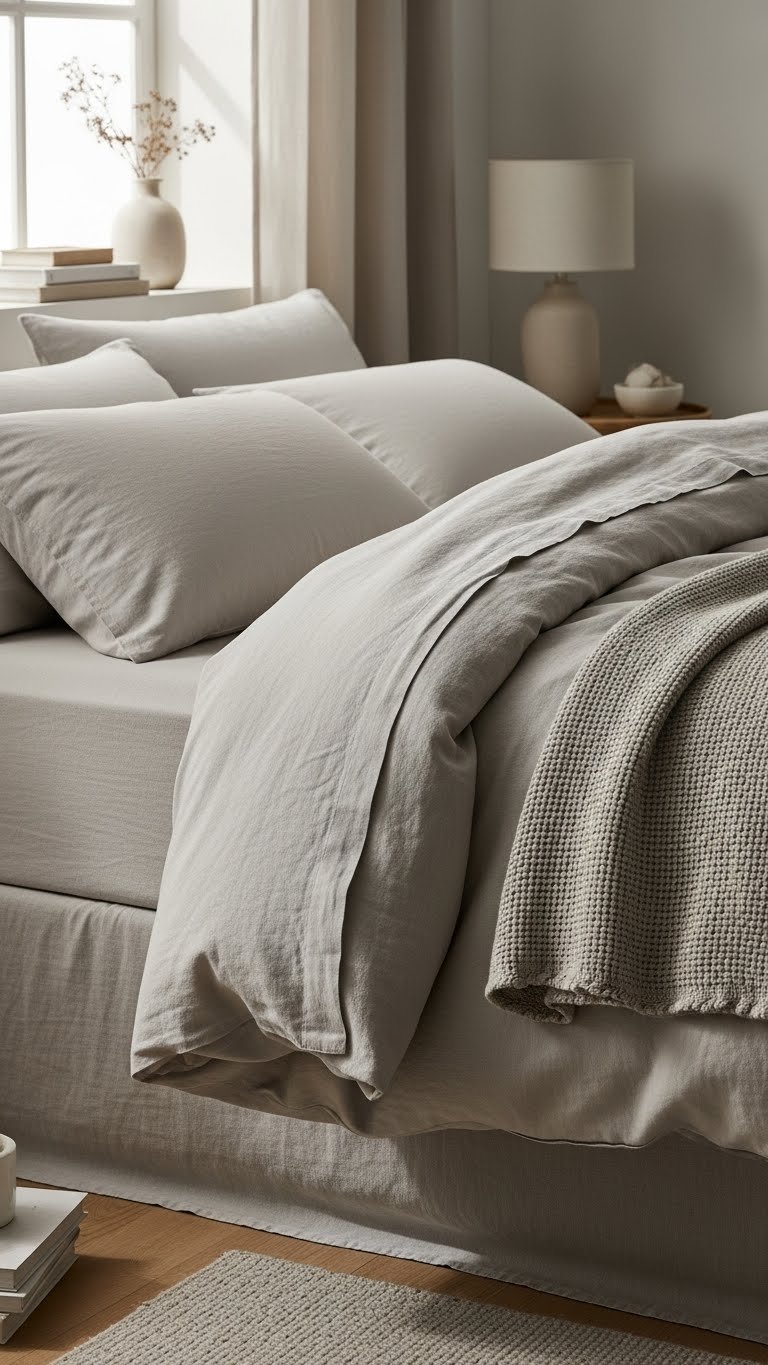 Layer textured linen in a single color to create a calm, sophisticated bed that feels curated without trying too hard. You’ll mix linen textures—slubby sheets, washed duvet, chunky weave throws—to add depth while staying minimal. Choose muted palettes to keep mood serene and flexible; you’ll swap accents seasonally, keep clutter low, and enjoy a liberated, restful retreat that reads effortlessly modern.