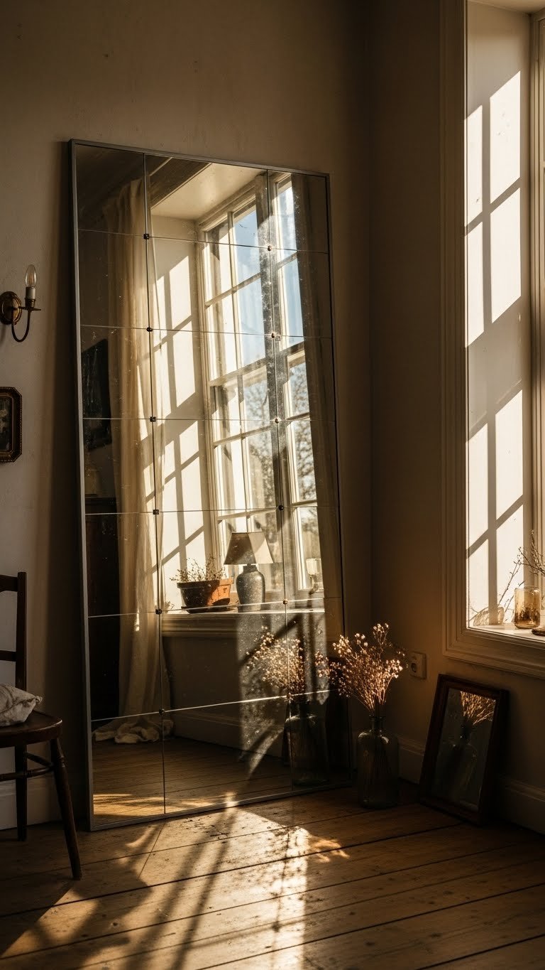 Opposite a sunlit window, a well-placed mirror doubles daylight and instantly makes your room feel brighter and bigger. Position an antique mirror to catch and scatter energy, creating layered window reflections that extend views and mood. You’ll amplify light, carve open space, and inject vintage chic without clutter. Choose scale and frame that mirror your free, effortless lifestyle.