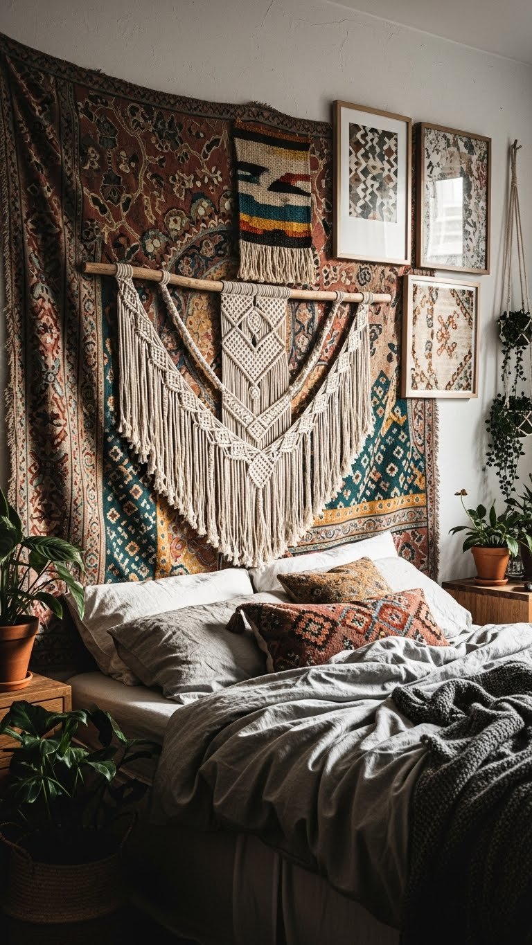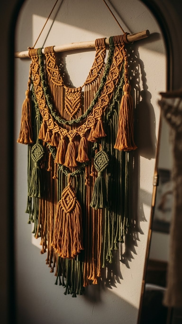 If the mirror brought light and vintage texture, macramé adds tactile warmth and earthy rhythm to the same wall.