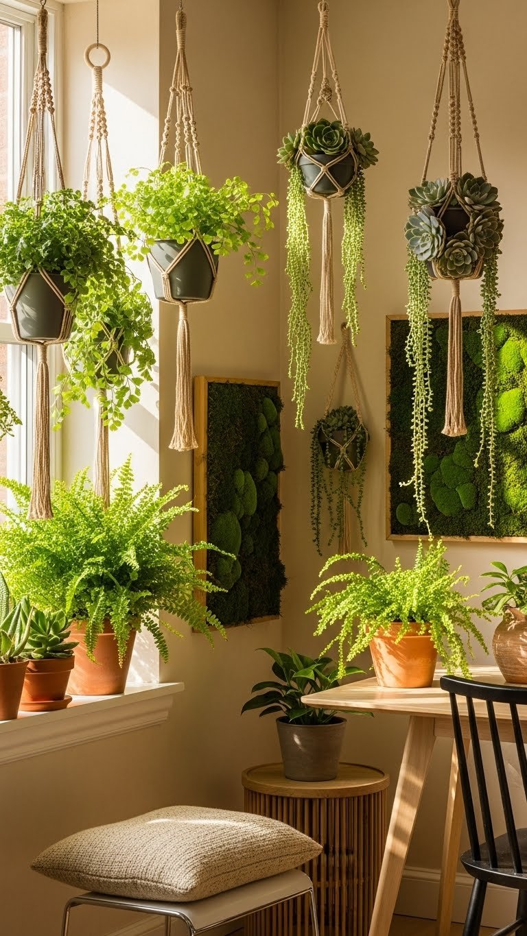 Tucked into corners or suspended over a windowsill, hanging ferns and succulent displays add instant life and sculptural interest without taking up floor space. You’ll mix hanging mosswalls with airy macramé, craft succulent chandeliers for a boho-meets-modern vibe, and let plants define zones.