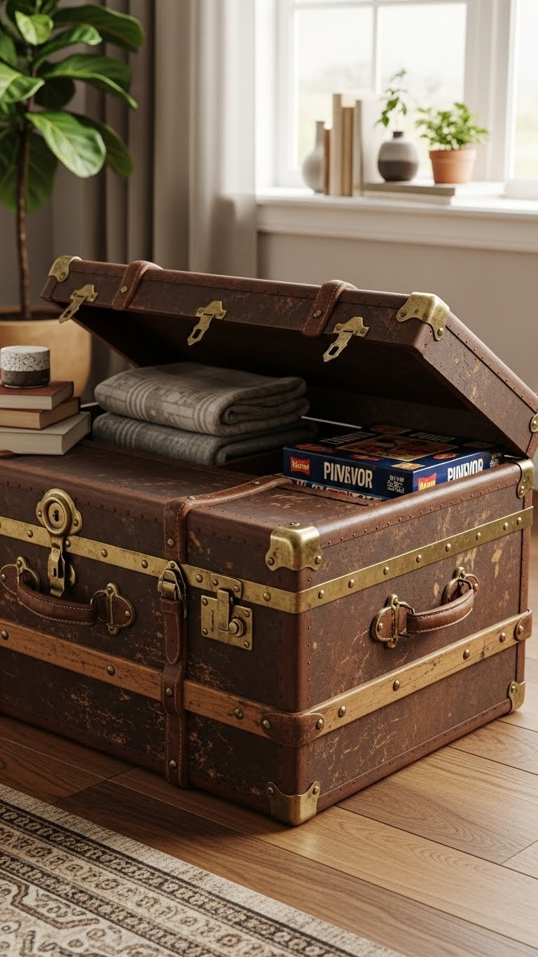 A vintage trunk coffee table with storage anchors a living room with character and purpose, giving you a statement surface that hides blankets, board games, or seasonal decor.