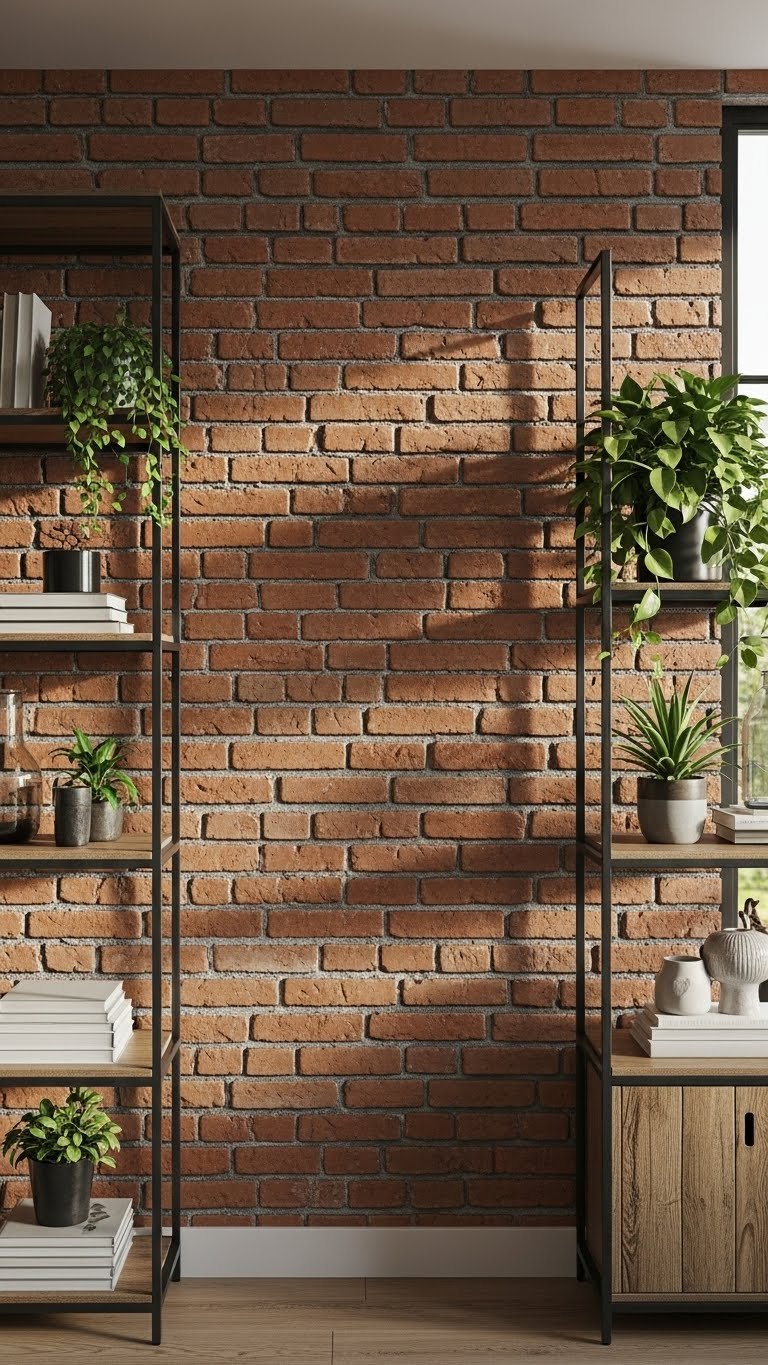 If you loved the warm, textured vibe of a tapestry headboard, try channeling that same cozy contrast with an exposed brick accent wall paired with sleek metal shelving.