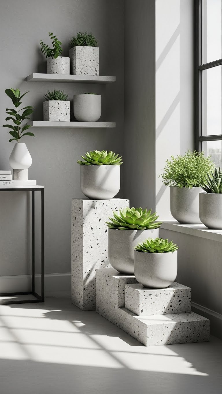 Bring urban greenery to life with concrete-look planters that mix industrial edge and soft foliage. You’ll pair industrial succulents with minimalist pots and terrazzo bases for contrast, creating a liberated, modern vibe. Position them on windowsills, staggered shelves, or a slim console to claim your space. The aesthetic feels raw yet curated, letting plants and structure breathe without constraints.