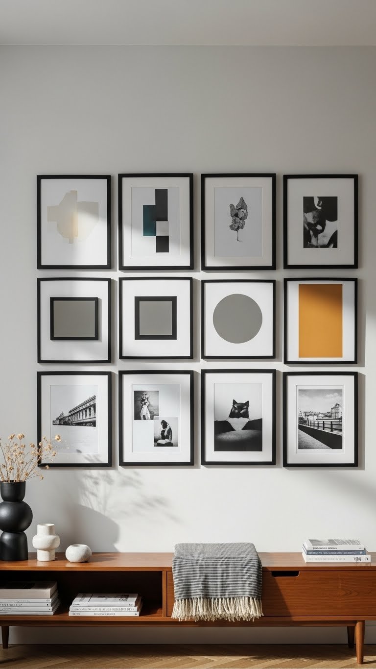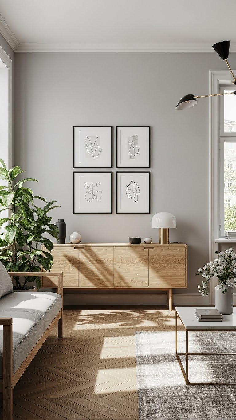 The crisp geometry of a black-framed gallery grid pairs beautifully with light wood furniture against soft gray walls, so you can soften the room’s stark lines without losing modern edge. Embrace Scandinavian warmth through pared-back shapes, natural grain, and uncluttered surfaces.