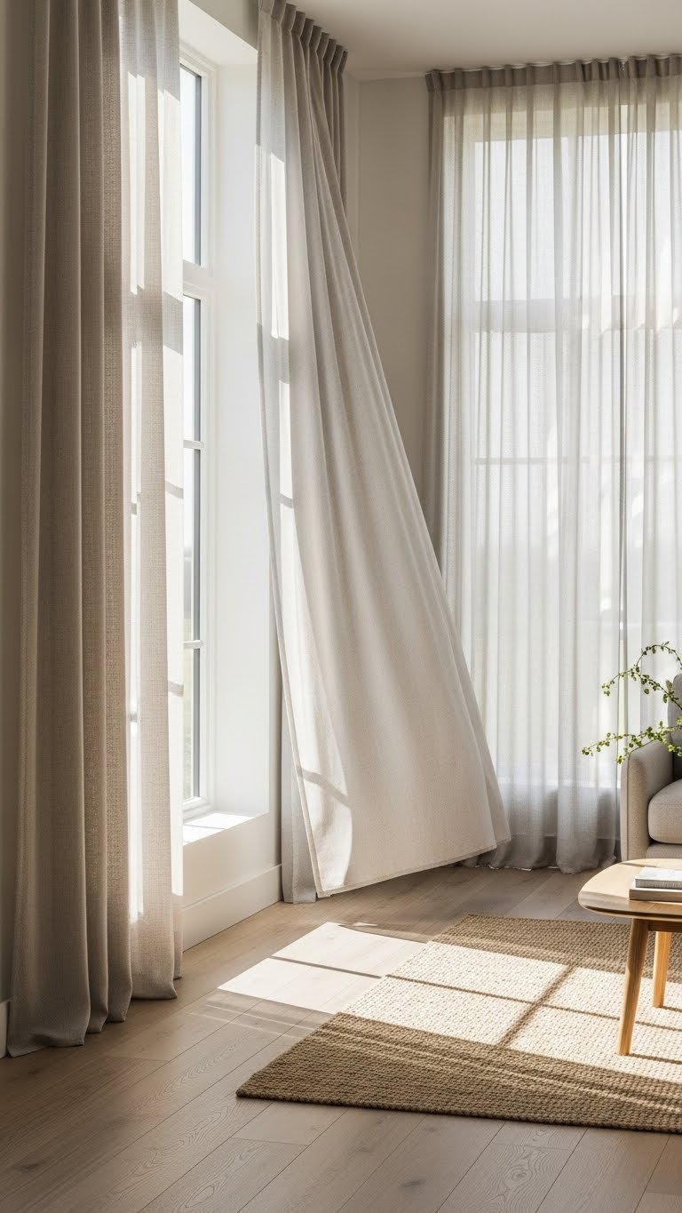 When you hang floor-to-ceiling linen curtains, you instantly lift a room’s proportions and soften its light; their natural weave adds texture without fuss. You’ll choose breathable panels that offer sheer privacy while still inviting views and breeze.