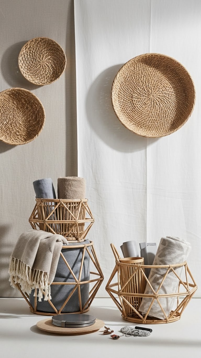 Linen panels set a calm, airy stage—now bring in geometric woven baskets to keep that serenity tidy. You’ll tuck blankets, chargers, and small clutter into sculptural shapes that read like art. Mix woven planters and basket wallprints for layered texture without visual chaos. Choose neutral tones and bold shapes to stay minimalist yet expressive, so your space feels free, curated, and effortlessly organized.