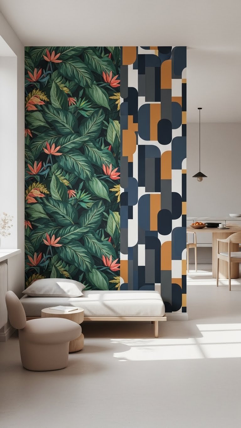 You’ll choose a bold botanical mural or crisp abstract geometrics to define a corner, hallway, or behind a bed. Mix with simple furniture, matte finishes, and open layouts so the pattern breathes — it’s freedom with sharp, confident style.