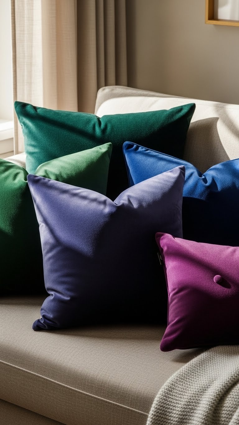 Velvet Jewel-Toned Cushions on Neutral Sofa