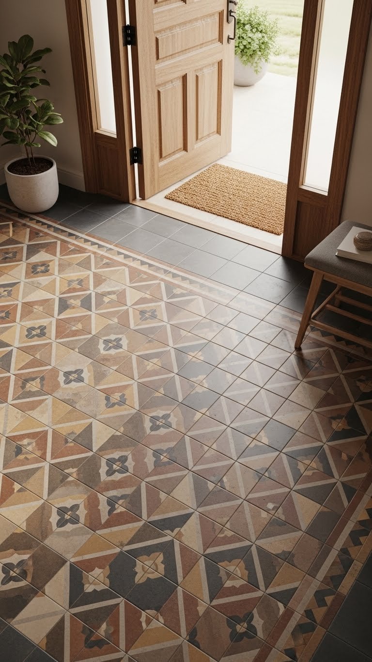 Count on patterned entryway floor tiles to set the tone the moment someone steps in—you’ll get instant personality, direction, and durable style without overcommitting to bold wallpaper or permanent paint.