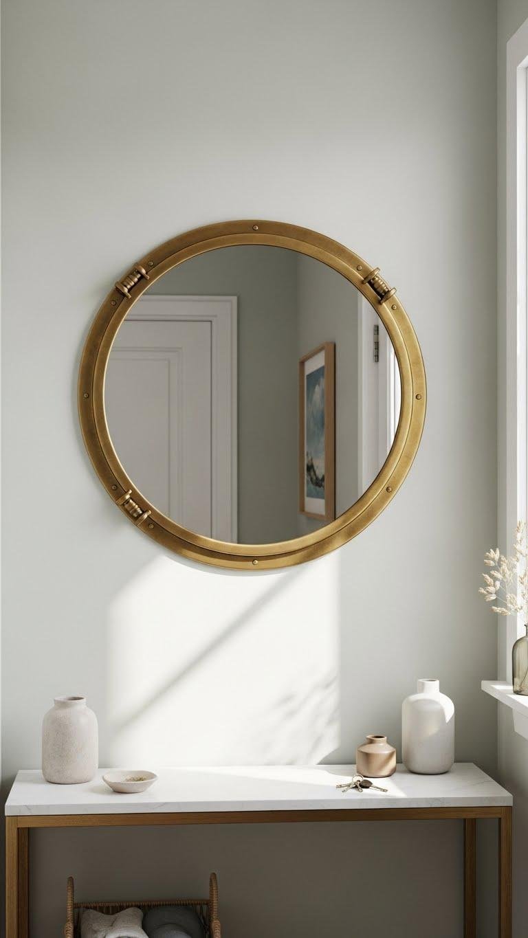 Think round: a porthole mirror brings sculptural charm and instant depth to a tight entryway, echoing nautical and modern trends without overwhelming the space. You’ll pick a round porthole to bounce light, frame a sightline, and create a liberated, airy feel. Brass frames add warmth and boldness without bulk. Hang it solo or in a curated cluster for effortless impact.