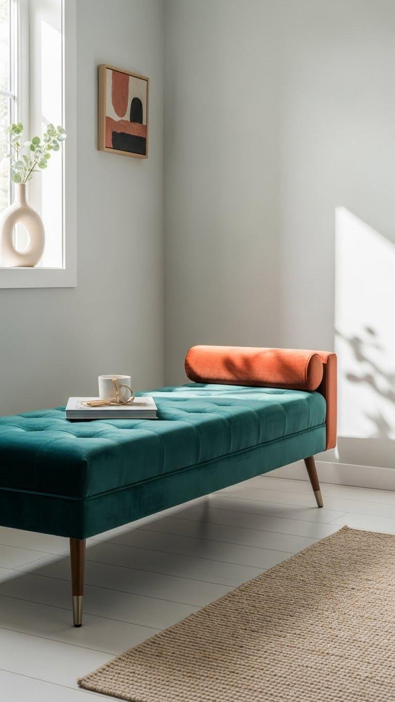 One bold upholstered bench can turn a neutral entryway into a stylish statement — pick a saturated jewel tone or warm terracotta to inject instant personality and contrast with pale walls.