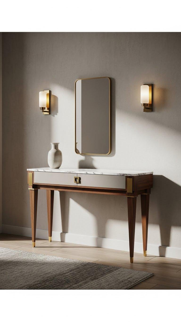 The Empire II console—or any similarly sculptural statement piece—anchors an entry with architectural confidence, so choose one with bold proportions, mixed materials (brass accents, lacquered wood, marble top), and clean lines that read modern yet timeless.