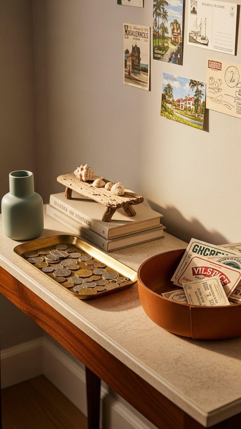 You’ll place travel tokens in a shallow tray, pin a postcard collage above, tuck vintage luggage labels into a leather bowl, and display a minimal shell collection on a driftwood riser — effortless, wanderlust-ready, and distinctly yours.