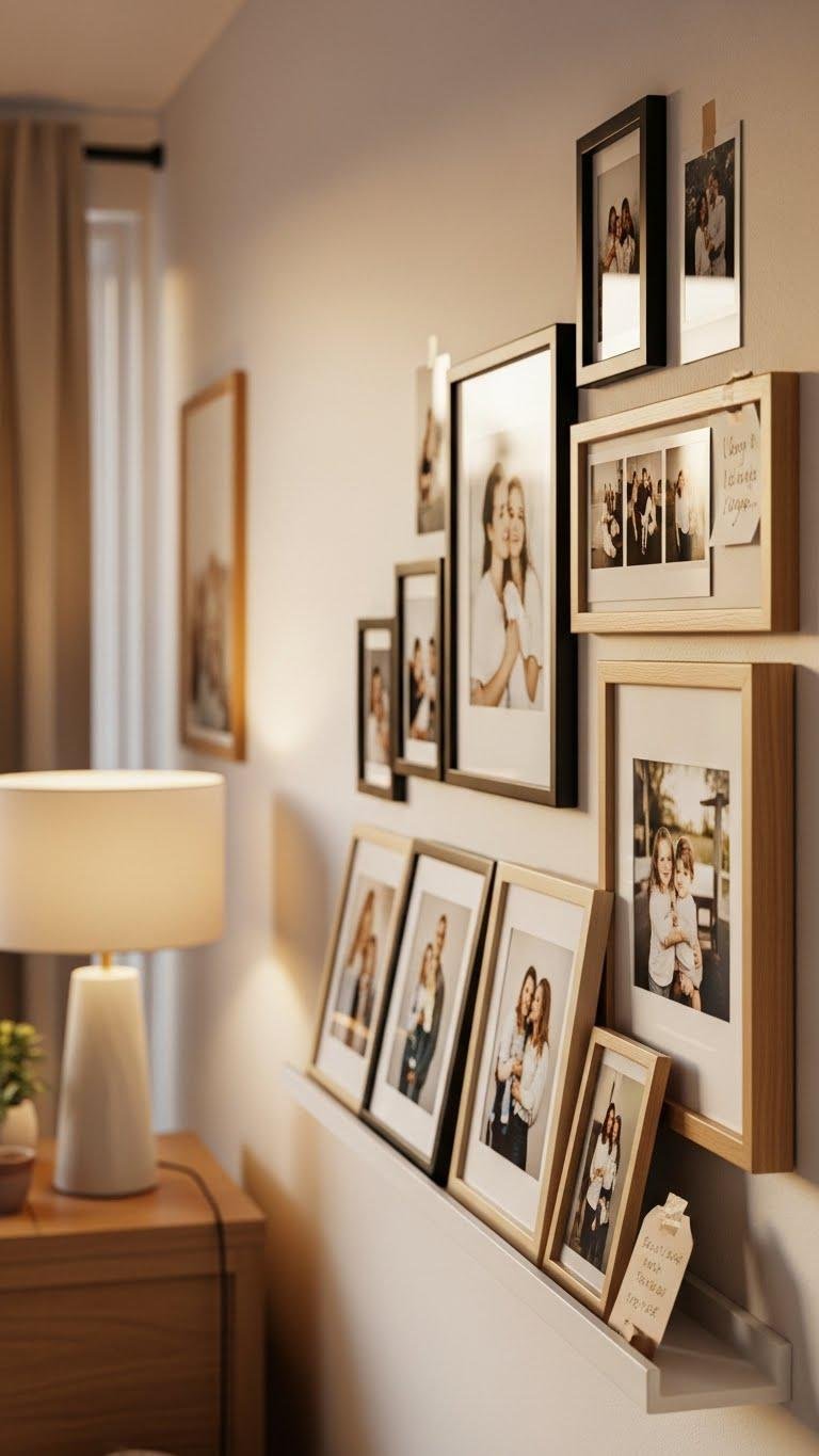 Bring your entry to life by styling family photos with intentionality—mix candid, framed images with a few unexpected pieces like a Polaroid strip or a small handwritten note so the display feels lived-in, not staged. You’ll pair matching frames for cohesion, add handwritten captions for voice, and arrange varying sizes asymmetrically.