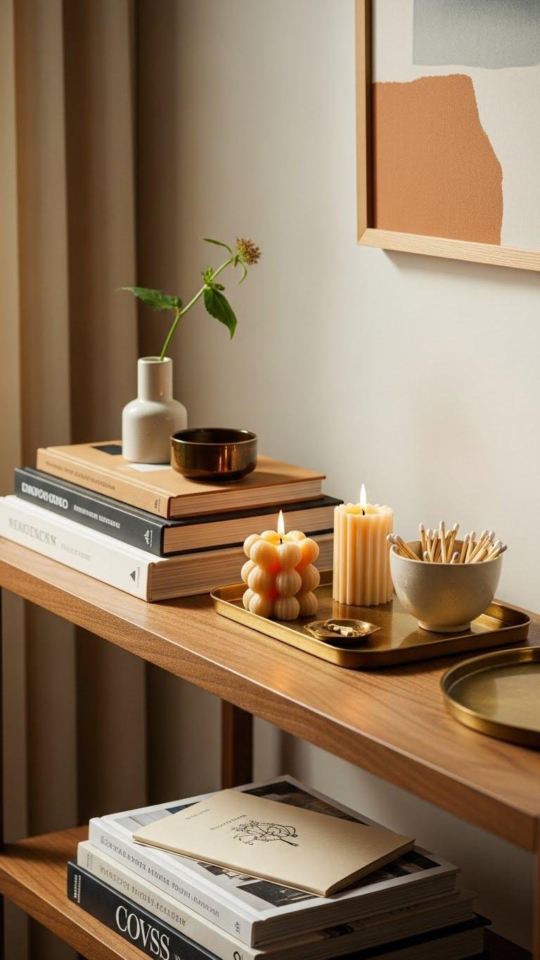 When you layer a few art books, a low stack of coffee-table volumes, and one or two sculptural candles on your console, you create a lived-in vignette that reads both curated and effortless.