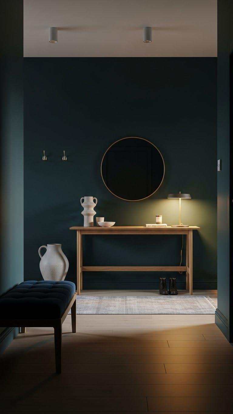 Choose a deep forest wall to anchor a minimalist console, or embrace navy velvet accents for luxe depth. You’ll free the area from fussy ornament, rely on bold color to frame arrivals, and let moodful tones invite confident, uncluttered entrances.