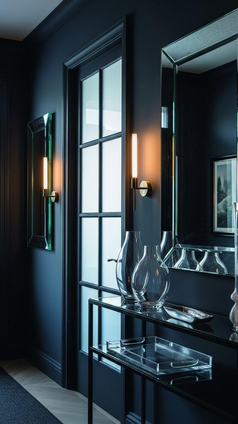 Deep, moody walls set a theatrical stage for glass accents that bounce light and lift the mood. You’ll mix etched glass mirrors, slim console lamps and frosted panes to soften glare while keeping brightness.