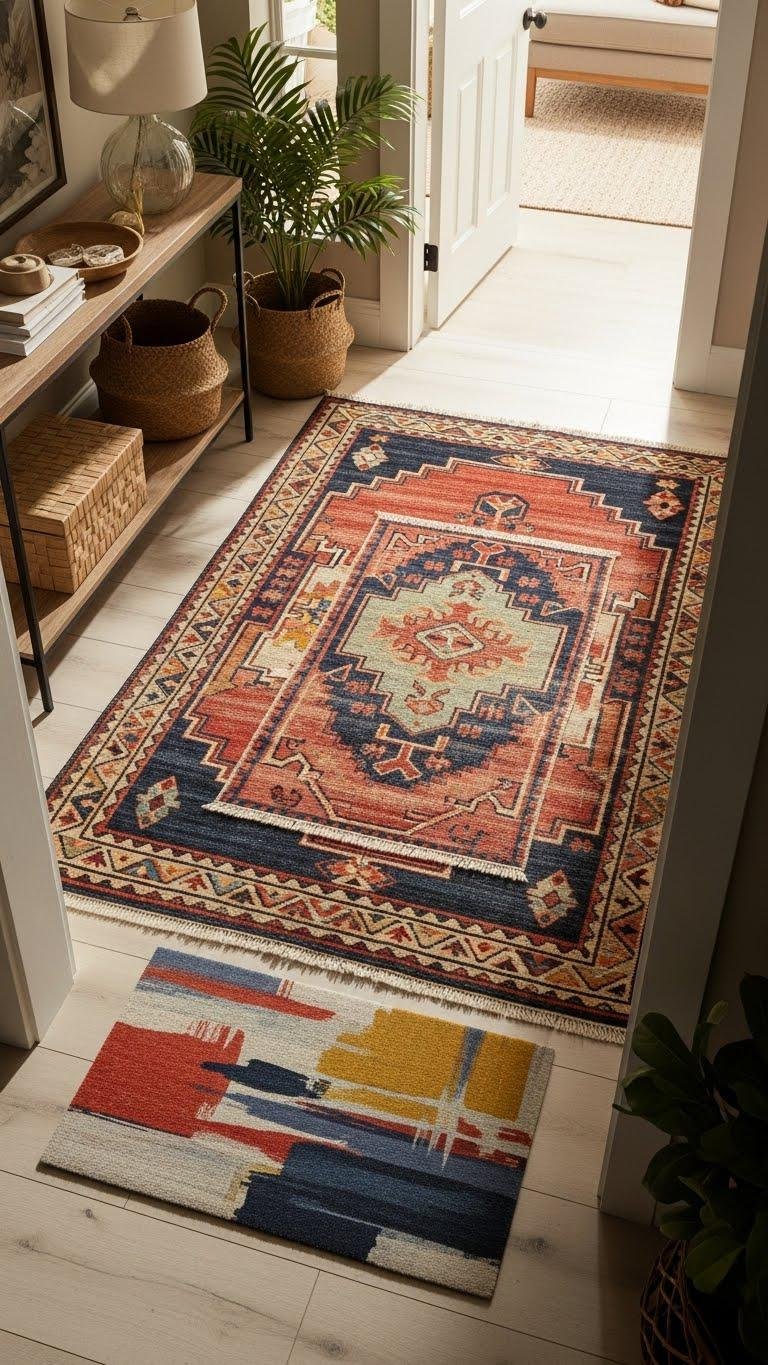 Layer a patterned rug to anchor your entry and pull the room together — bold geometrics, faded kilims or painterly abstracts can set the tone before guests step inside. Choose pieces with geometric motifs or mix in vintage runners for personality.