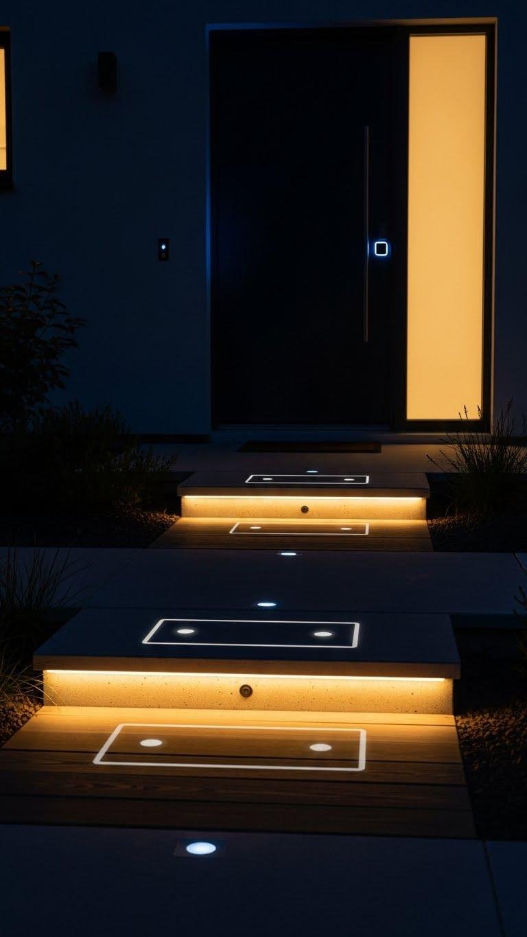 You’ll choose discreet step lights and sensor mats to trigger warm, low-glare illumination, creating a welcoming path. It’s minimalist, secure, and liberating—lighting that responds so you don’t have to.