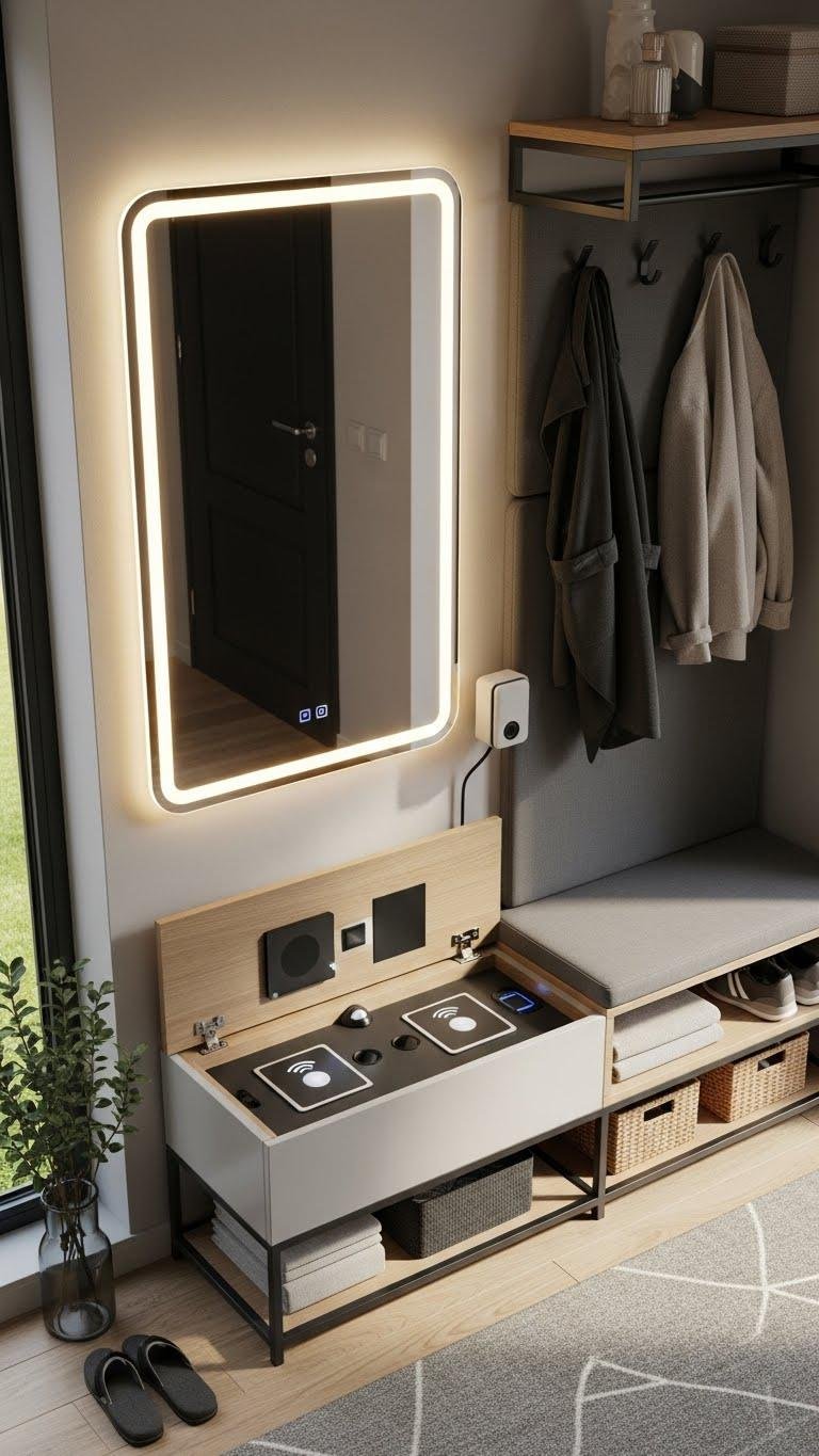 A bench can hide wireless charging, motion-sensor lights, and storage, keeping clutter gone and mornings fluid.