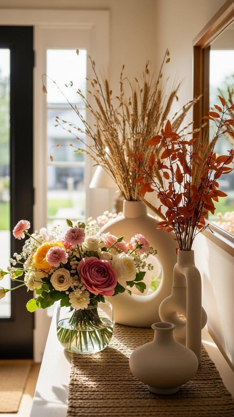 Mix fresh blooms with silk bouquets for low-maintenance pops, swap in dried grasses arrangements for autumnal calm, and choose sculptural vases.