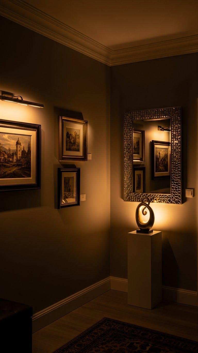 Draw attention to artwork and mirrors with focused accent lighting that adds depth and drama without overpowering the space. You’ll use art wash to create even, flattering illumination and targeted sculpture uplighting to sculpt form and shadow. Position low-glare fixtures above frames and mirrors, choose warm LEDs, and keep controls simple so you can shift mood instantly while keeping the entryway bold and effortless.