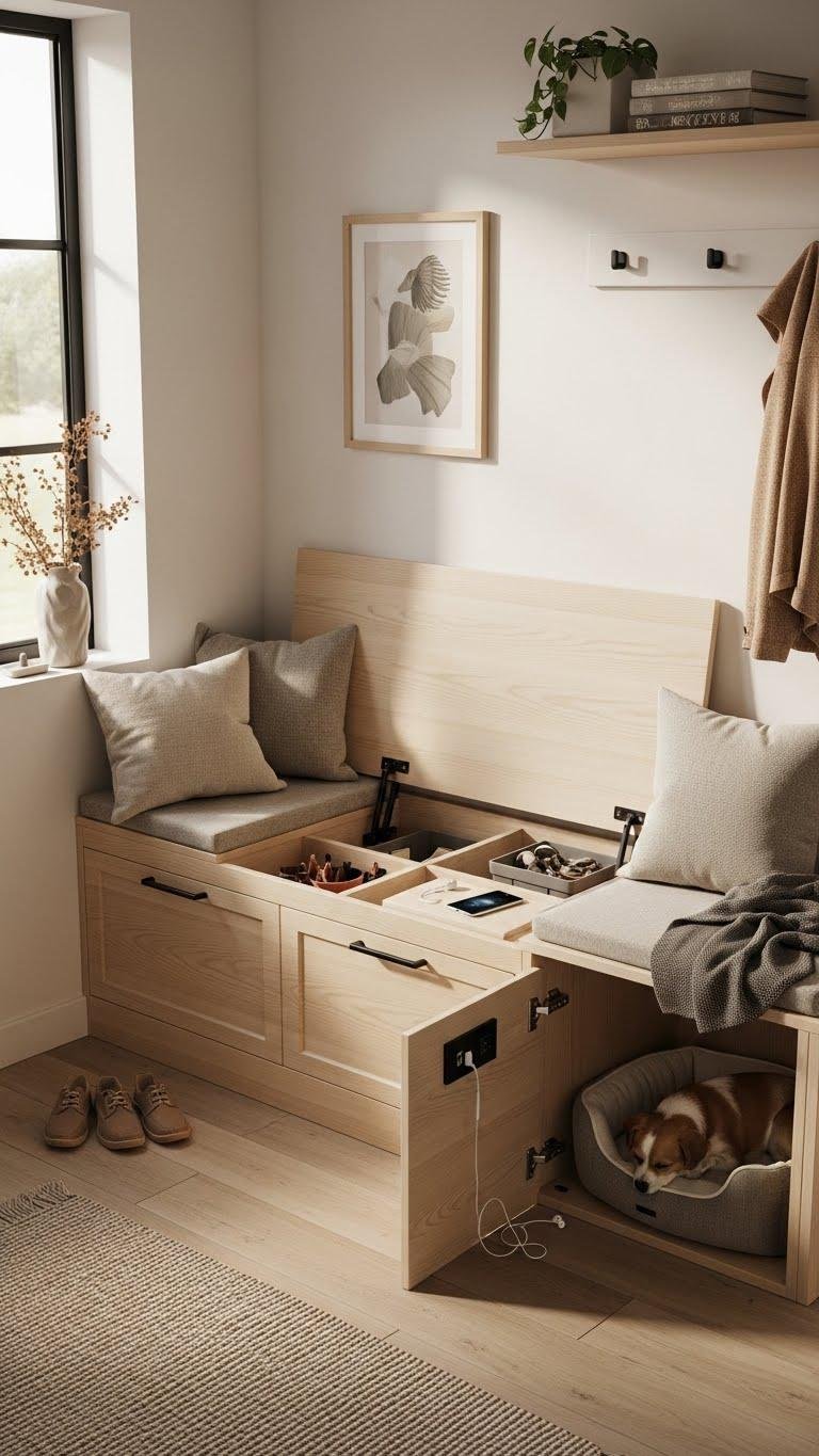You’ll love a streamlined bench with lift-top compartments, integrated under bench charging for devices, and a tucked pet bed nook that keeps paws close without clutter.