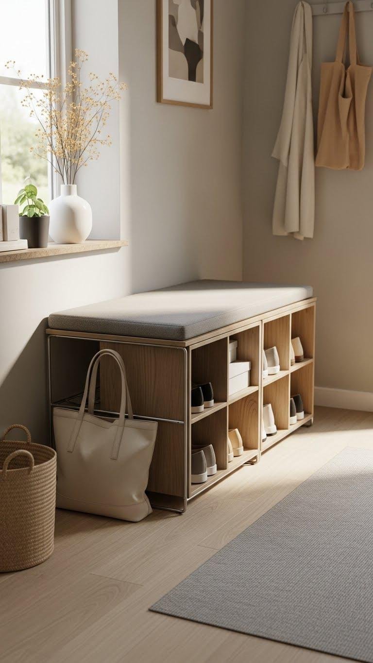A built-in bench with hidden storage gives your entryway instant polish and real-world function: sit, stash, and keep the surface uncluttered.