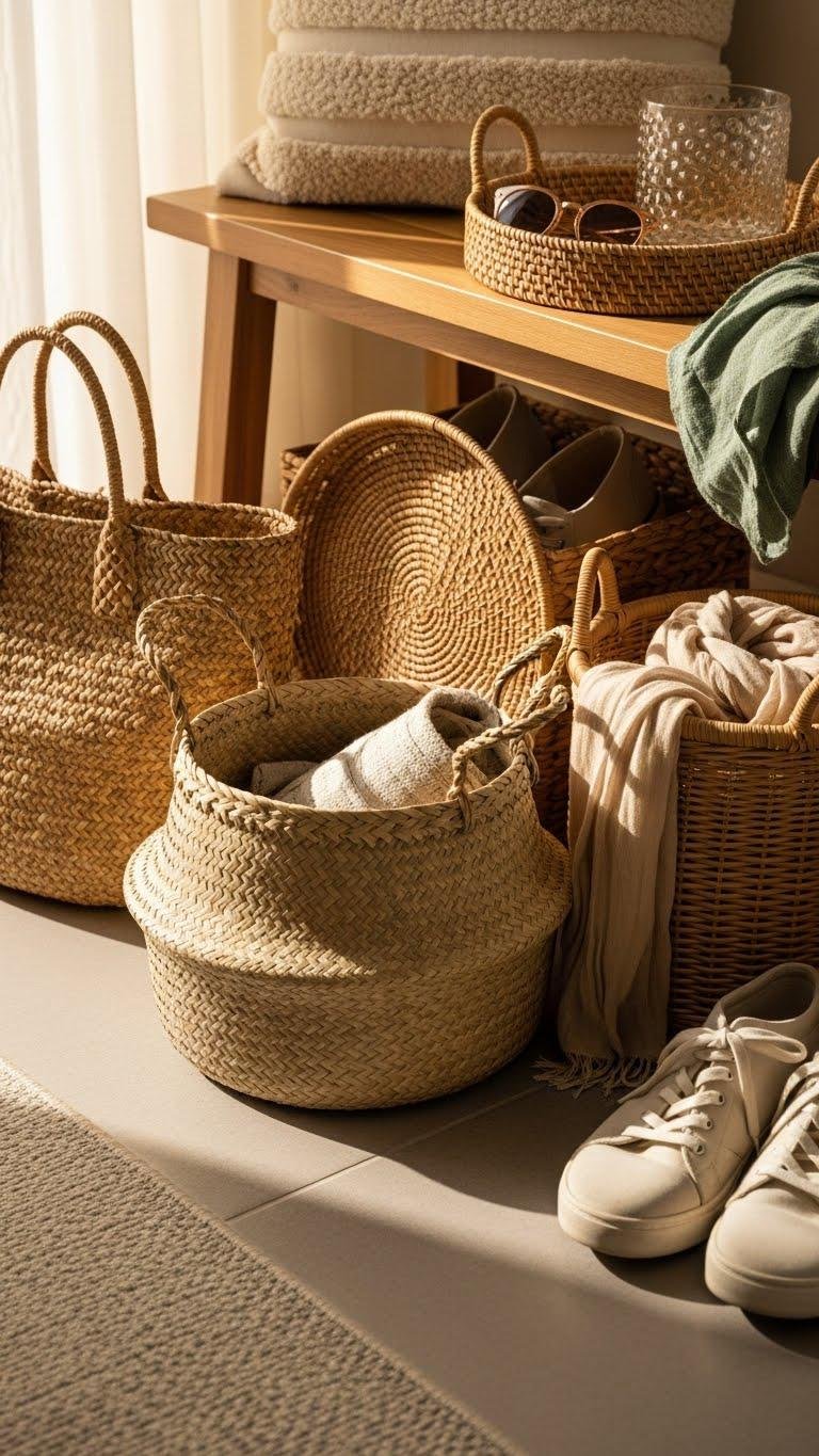 Several woven baskets instantly tidy shoes and small accessories while adding texture and warmth to your entry. You’ll grab a braided tote or seagrass tray to corral shoe baskets, sunglasses, and scarves, keeping things effortless and accessible.