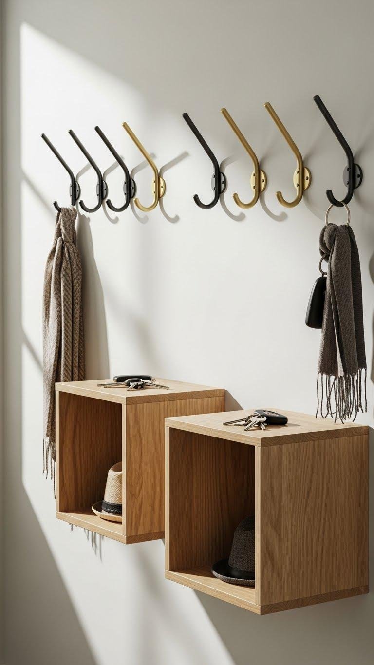 Hang a row of wall-mounted hooks and cubbies to turn dead wall space into instant, organized convenience. You’ll grab keys, hats, and scarves without clutter using matte hooks paired with floating cubbies for a light, airy look.