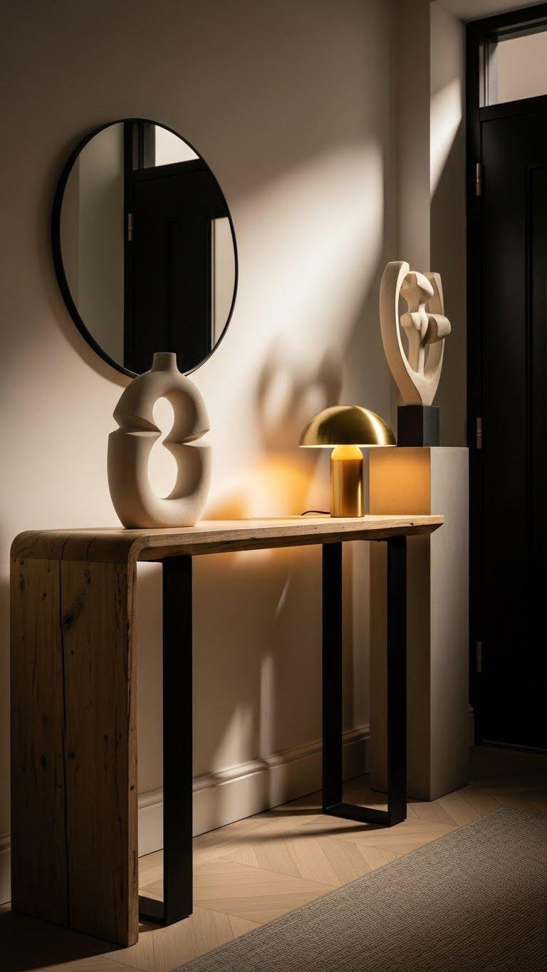 After you’ve cleared clutter with hooks and cubbies, bring in a sculptural console table to make the entry feel intentional and cinematic.