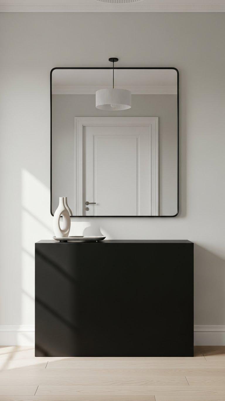 When you place a bold matte-black console under an oversized mirror, the entryway instantly reads modern and purposeful: the deep, non-reflective finish anchors the space while the large mirror amplifies light and scale, balancing drama with function.